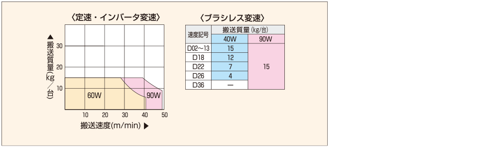 注)速度や搬送質量など使用条件により、モータ出力をランクアップされる場合は、上の搬送質量グラフでモータ出力を選定してください。