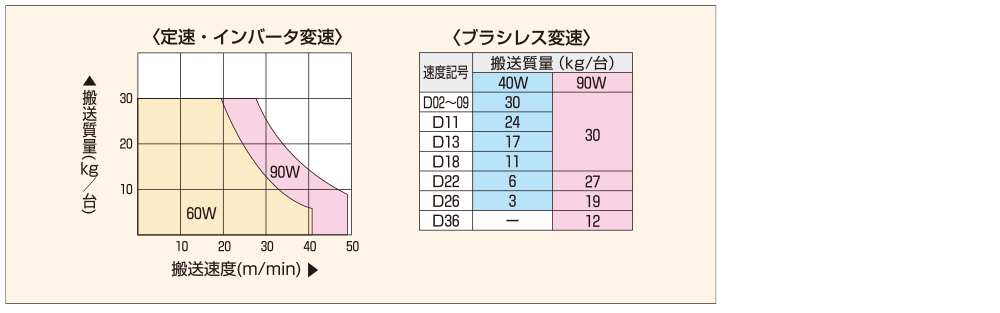 注)速度や搬送質量など使用条件により、モータ出力をランクアップされる場合は、上の搬送質量グラフでモータ出力を選定してください。