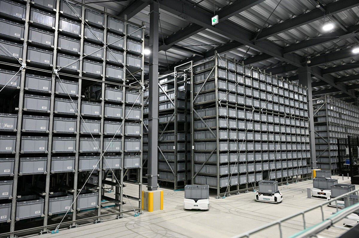 商品は専用コンテナに2アイテムずつ投入され、ラックに保管されますが、格納はすべて搬送ロボットが行います。ラックの高さは天井まであり、建屋の天井空間の無駄をなくすとともに最大5670コンテナ、約12000アイテムの商品を保管することができます。