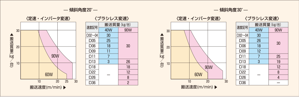 注)下記グラフ/表は分散荷重時の搬送質量を表します。