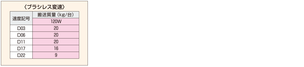 注)変速仕様の場合、搬送速度が最大速度の1/3になると、搬送質量は最大速度時の40%に低下します。