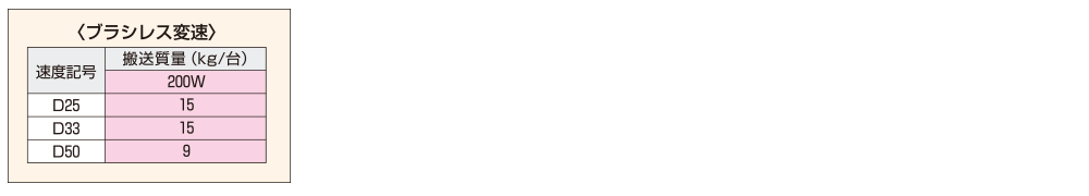 - 1.変速仕様の場合、搬送速度が最大速度の1/3になると、搬送質量は最大速度時の40%に低下します。