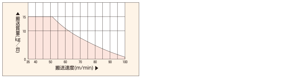 - 1.変速仕様の場合、搬送速度が最大速度の1/3になると、搬送質量は最大速度時の40%に低下します。