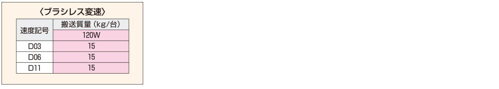 注)変速仕様の場合、搬送速度が最大速度の1/3になると、搬送質量は最大速度時の40%に低下します。