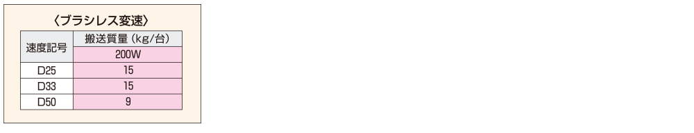 - 1.変速仕様の場合、搬送速度が最大速度の1/3になると、搬送質量は最大速度時の40%に低下します。